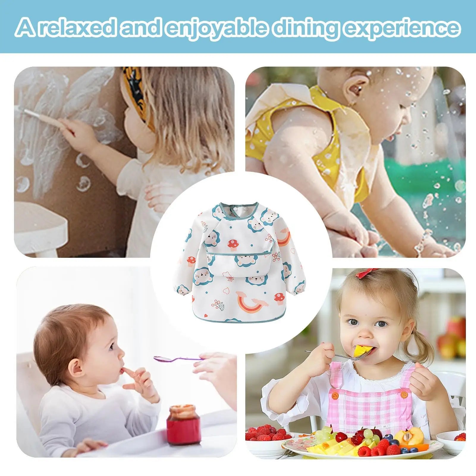 2.Flexible Warm Protection: This long sleeve kid bib includes adjustable neck and wrist designs with back dual-row clasps to offer a tailored fit, reducing irritation and ensuring comfort for babies during feeding trainings or arts-and-crafts time